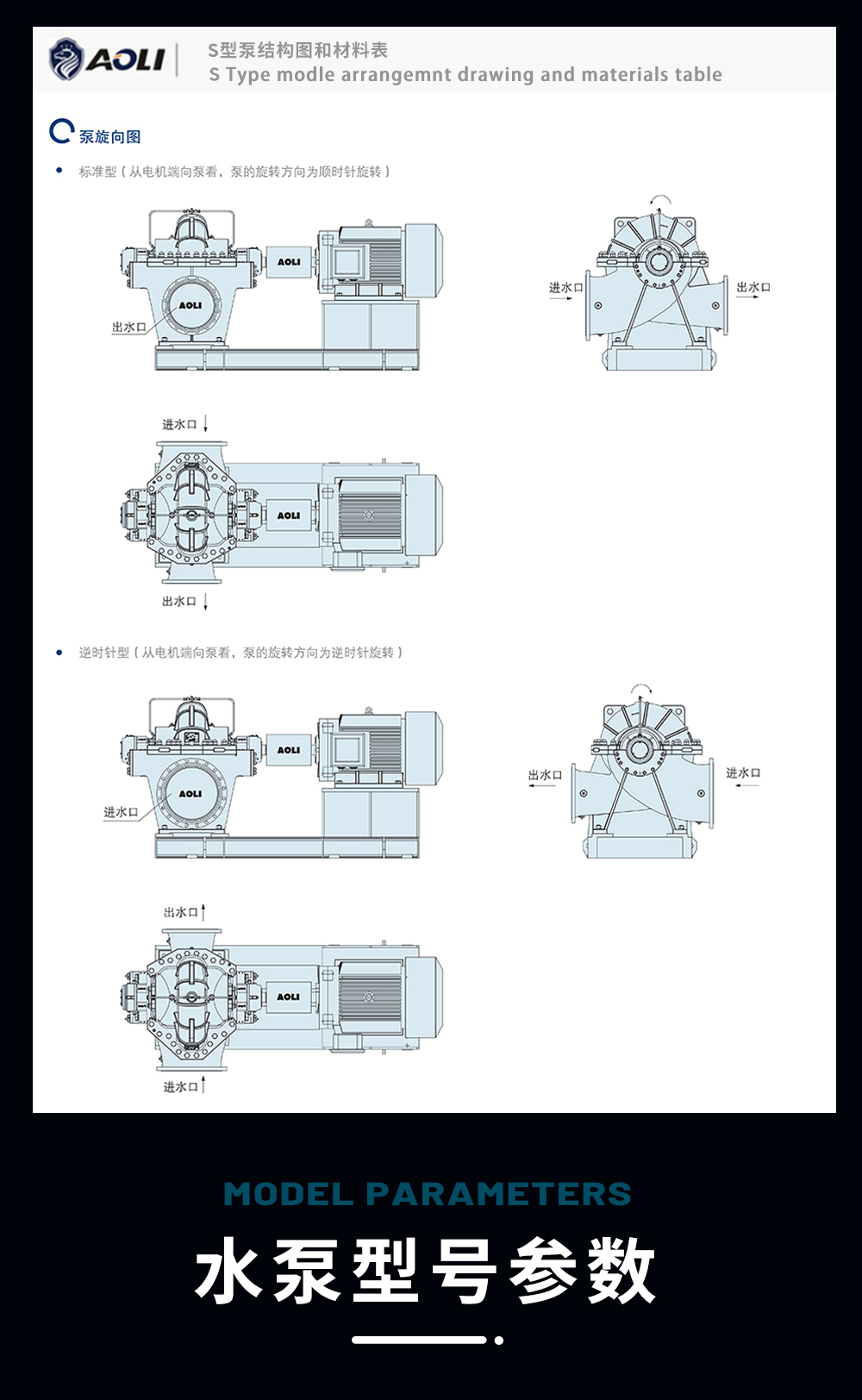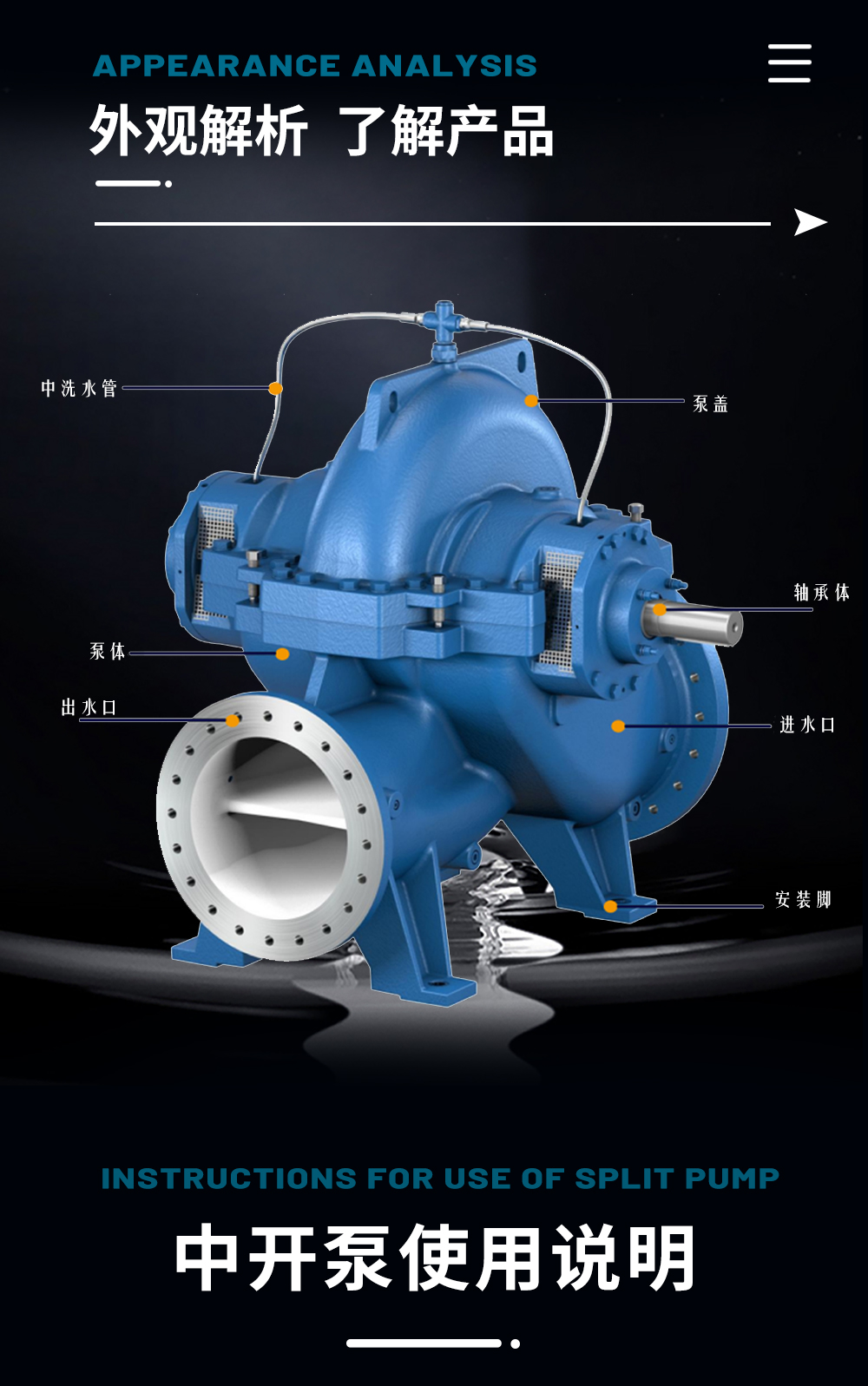 S型雙吸中開(kāi)泵為單級(jí)、雙吸水平中開(kāi)式離心清水泵,適應(yīng)于工業(yè)和城市給排水泵,可作為工廠、城市、電站、水利工程等排水或給水用泵,亦可用于農(nóng)田灌溉?!癝”系列型泵是高效節(jié)能產(chǎn)品,具有結(jié)構(gòu)簡(jiǎn)單,性能優(yōu)良的特點(diǎn)。供輸送不含固體顆粒的清水或物理、化學(xué)性質(zhì)類(lèi)似于水的其它液體,被輸送的介質(zhì)溫度為0℃~80℃,允許進(jìn)口壓力0.6MPa。