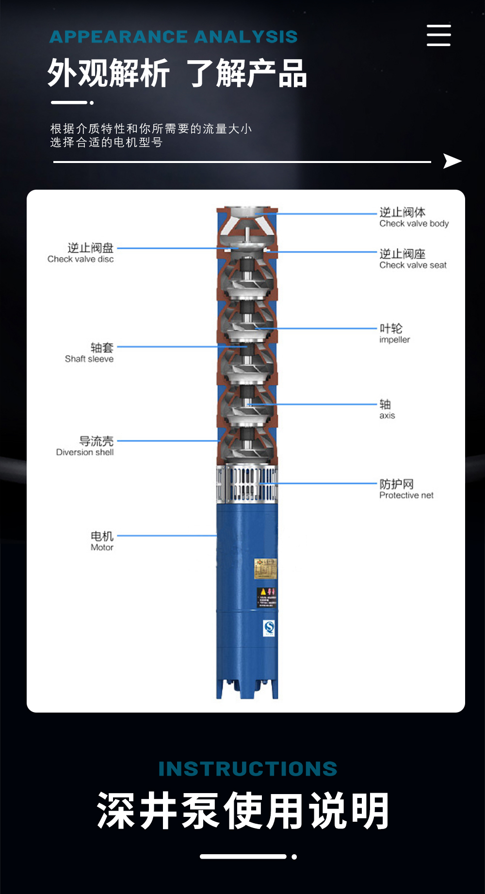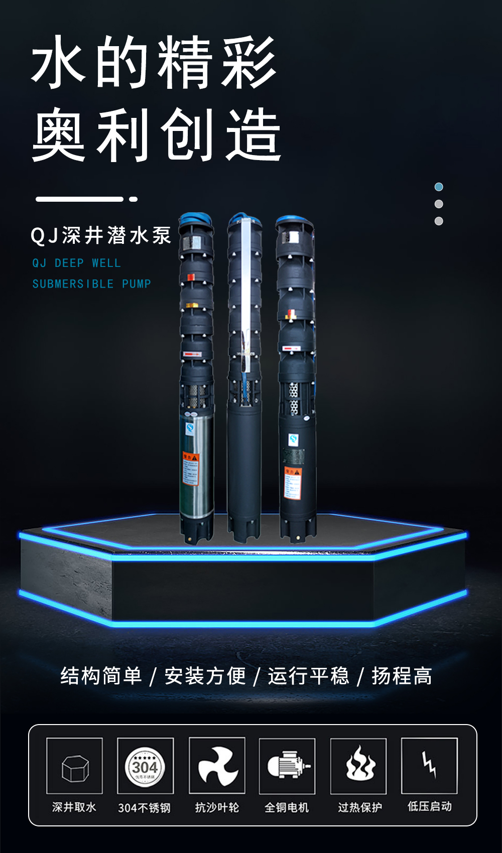 QJ型深井泵是電機與水泵直聯(lián)一體潛入水中工作的提水機具,它適用于從深井提取地下水、也可用于河流、水庫、水渠等提水工程:主要用于農(nóng)田灌溉及高原山區(qū)的人畜用水,亦可供城市、工廠、鐵路、礦山、工地供排水使用。
