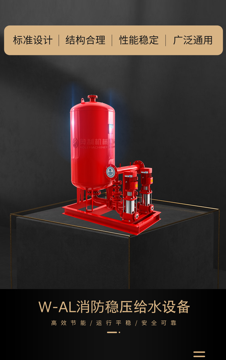 W-AL消防穩(wěn)壓給水設(shè)備是利用食品級橡膠作為氣水隔離的新型設(shè)備,一次充氣,常年運行使用。通過電接點壓力表和電控箱控制水泵運行,達到額定的壓力和連續(xù)供水。是按照國家消防設(shè)計規(guī)范GB50016《建筑設(shè)計防火規(guī)范》及國家標準 GB27898.3《固定消防給水設(shè)備第四部分∶ 消防增壓穩(wěn)壓給水設(shè)備》設(shè)計、制造的消防專用的增壓穩(wěn)壓設(shè)備。該設(shè)備由隔膜式氣壓罐、增壓泵、電控箱、儀表和管路附件等組成,適用于多層和高層建筑工程有增壓要求的消火栓給水系統(tǒng)及自動噴水滅火系統(tǒng)等各類消防給水系統(tǒng)。
