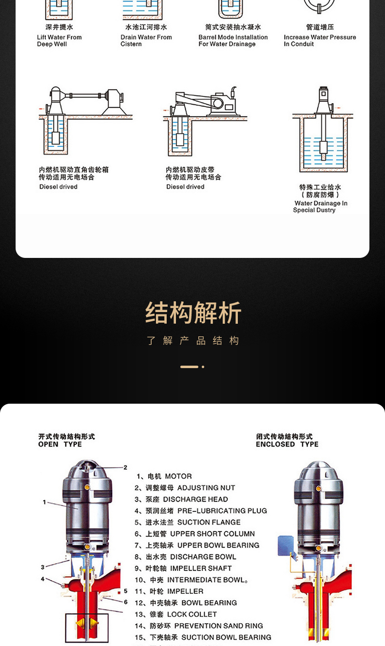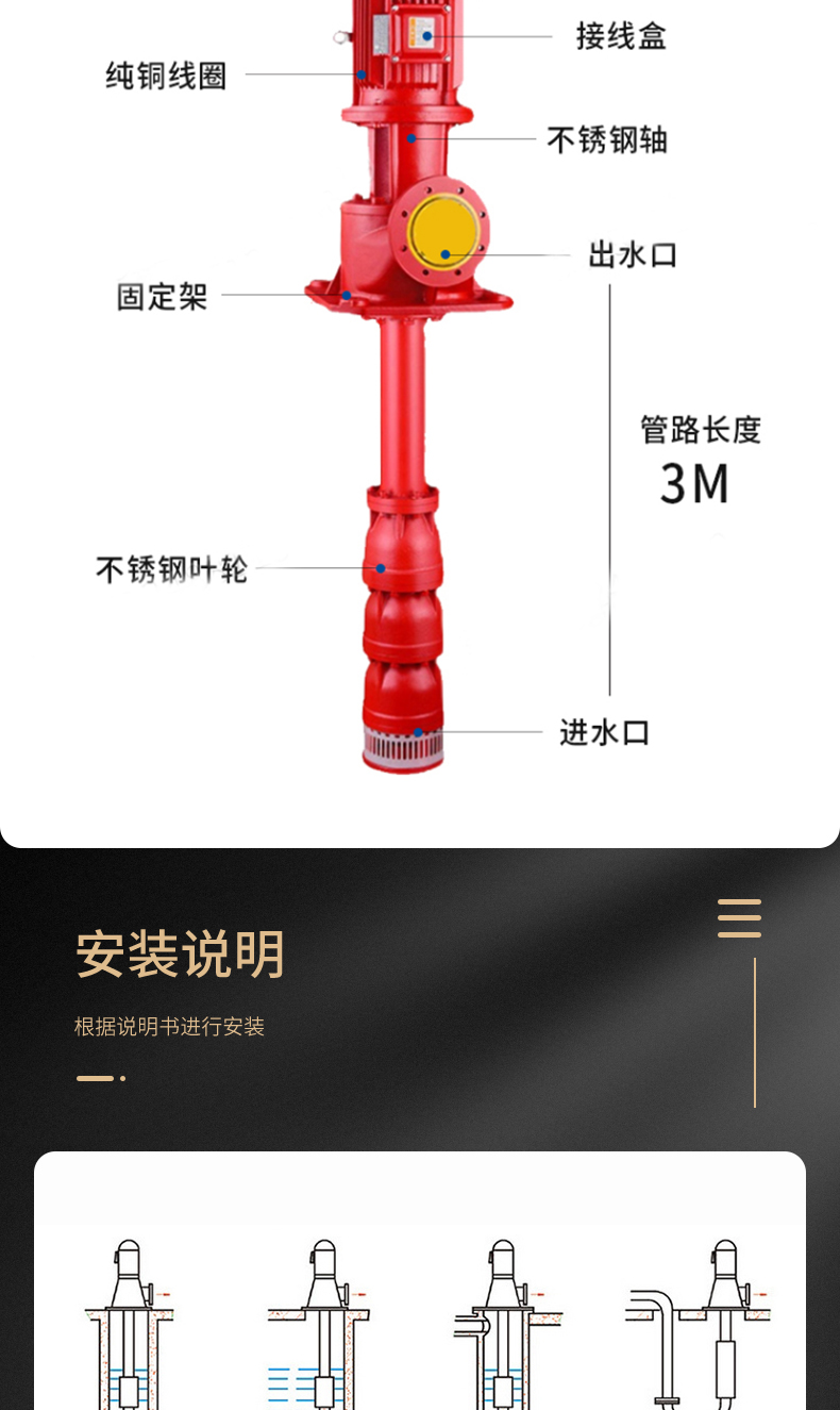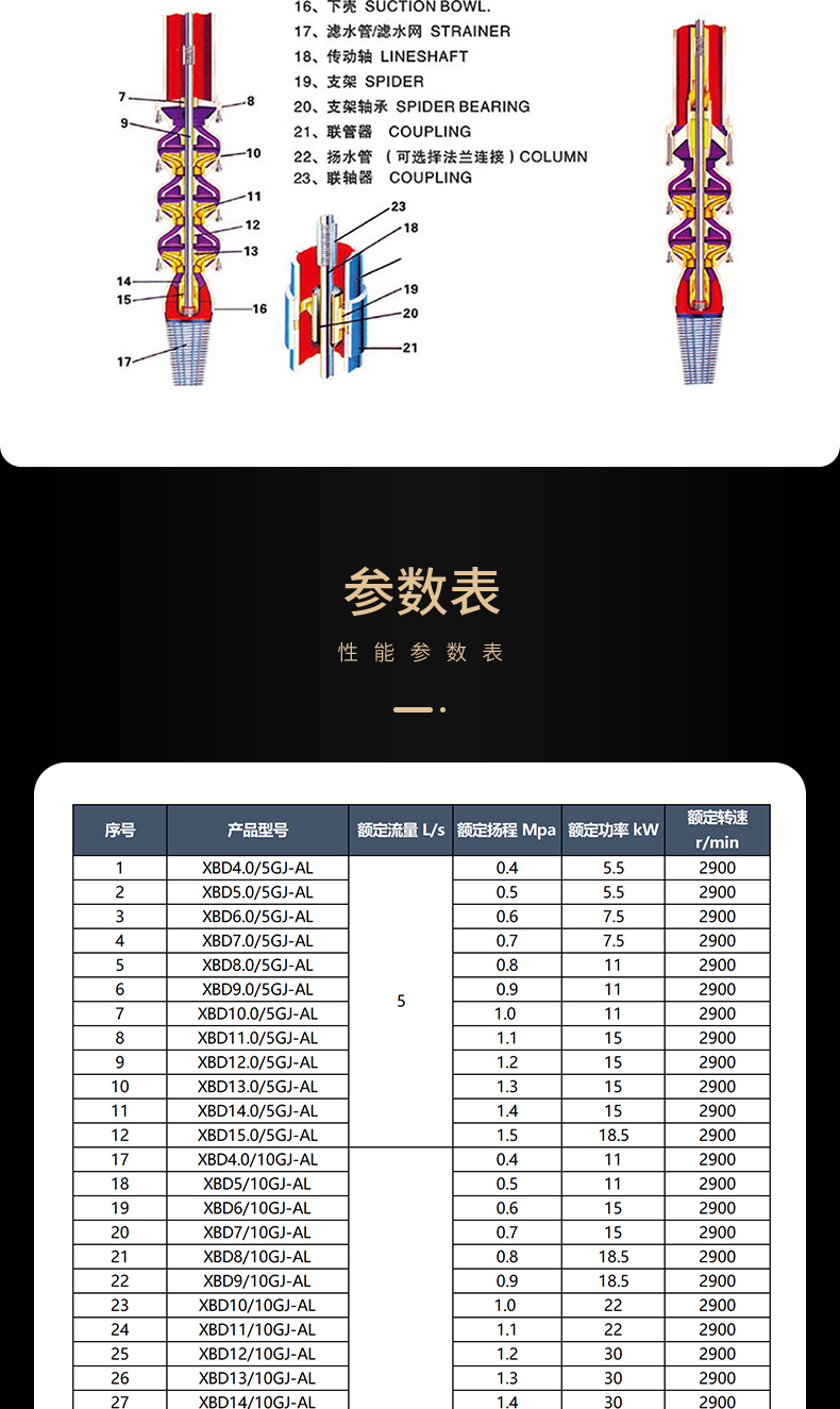 XBD-GJ長(zhǎng)軸深井消防泵是按照中國(guó)新消防泵新標(biāo)準(zhǔn)GB6245-2006《消防泵性能要求和試驗(yàn)方法》和美國(guó)消防協(xié)會(huì)標(biāo)準(zhǔn)NFPA20引進(jìn)開發(fā)的消防泵。產(chǎn)品經(jīng)中國(guó)消防裝備質(zhì)量監(jiān)督測(cè)試中心型式試驗(yàn),各項(xiàng)性能指標(biāo)全部達(dá)到標(biāo)準(zhǔn)要求,獲得消防產(chǎn)品認(rèn)可證書。長(zhǎng)軸消防泵由多個(gè)離心式葉輪和導(dǎo)流殼、揚(yáng)水管、傳動(dòng)軸、泵座、電動(dòng)機(jī)等部件組成。泵座和電機(jī)位于水池上方,電動(dòng)機(jī)的動(dòng)力通過(guò)與揚(yáng)水管同心的傳動(dòng)軸傳遞給葉輪軸,從而產(chǎn)生流量和壓力。