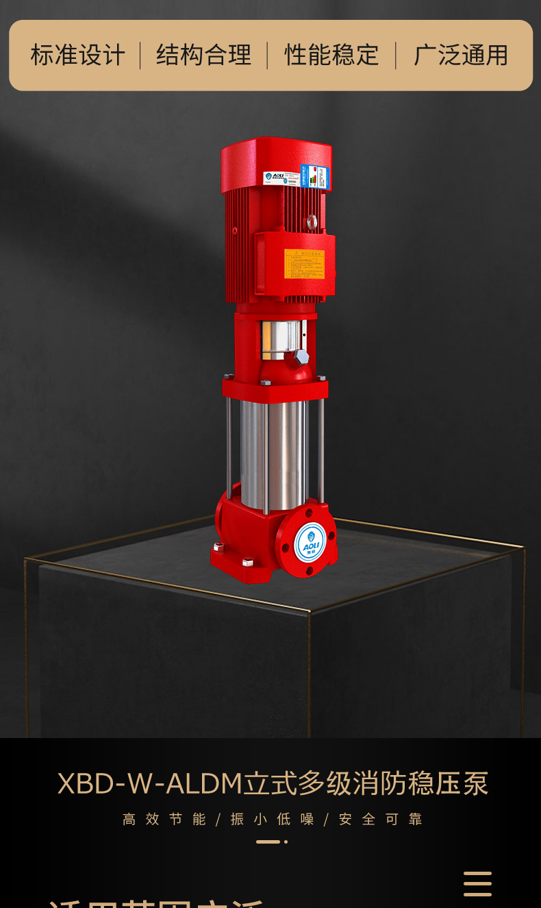 XBD-ALDM立式多級消防穩(wěn)壓泵,是在原有的ALDM立式多級泵的基礎(chǔ)上根據(jù)GB6245《消防泵》國家強(qiáng)制性標(biāo)準(zhǔn)要求進(jìn)行開發(fā)出的新一代中低壓消防穩(wěn)壓泵組產(chǎn)品。XBD-ALDM多級消防穩(wěn)壓泵在性能、結(jié)構(gòu)、材料和配套上均滿足GB6245 《消防泵》國家強(qiáng)制性標(biāo)準(zhǔn)的要求。由于采用優(yōu)秀的水力模型,因此該系列泵具有滿足用戶要求;采用立式泵結(jié)構(gòu),具有效率高、性能范圍廣的特點(diǎn),可更好的節(jié)省占地面積的優(yōu)點(diǎn);采用優(yōu)質(zhì)軸承和優(yōu)質(zhì)電機(jī),使泵運(yùn)行更為安全可靠、噪音低、振動小;采用水力平衡軸向力,減少平衡鼓,可使運(yùn)行更為平穩(wěn)。其