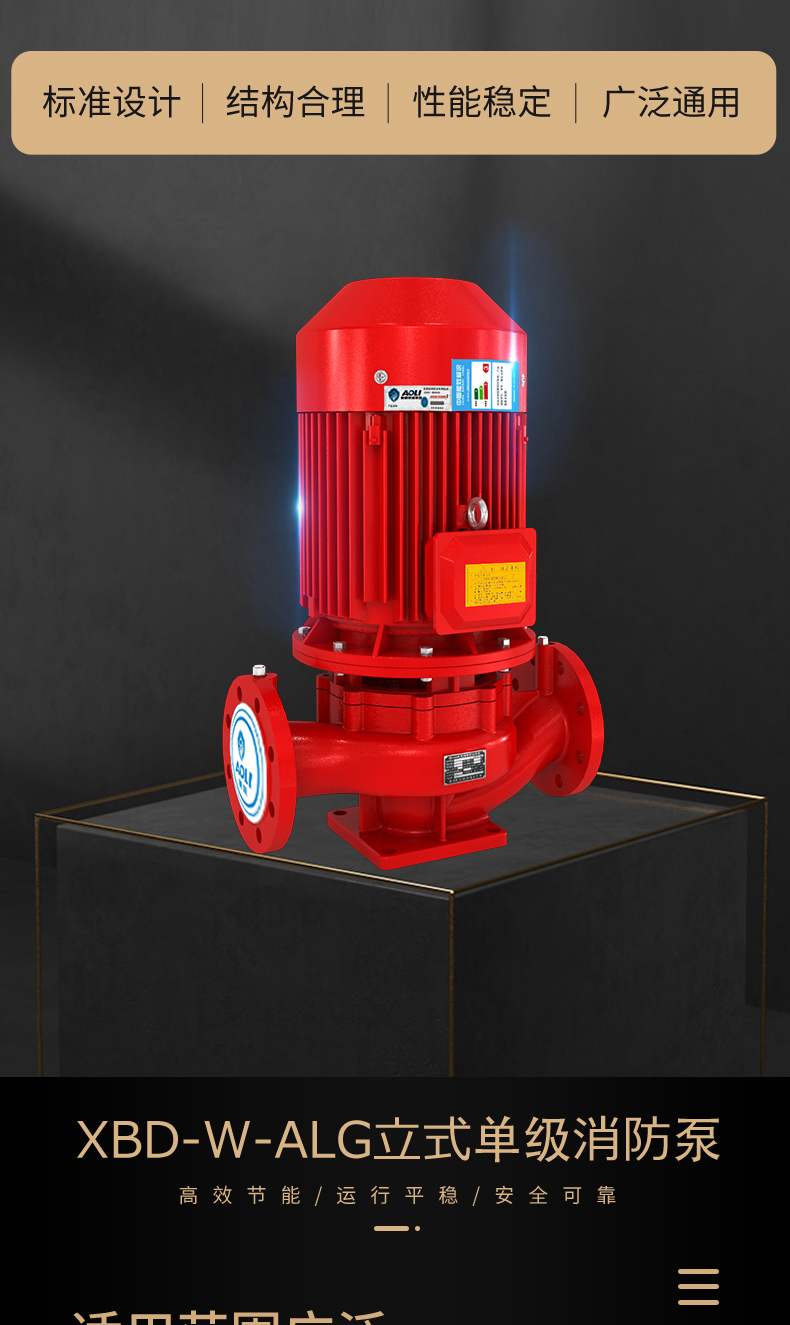 XBD-ALG立式單級(jí)消防泵是一種消防用具,供輸送不含固體顆粒的清水及物理化學(xué)性質(zhì)類似于水的液體之用,主要用于消防系統(tǒng)管道增壓送水和各種場(chǎng)合的消防給水(消防栓滅火系統(tǒng)、自動(dòng)噴淋滅火系統(tǒng)和水噴霧滅火系統(tǒng)等),也可適用于工業(yè)和城市給排水,高層建筑增壓送水、遠(yuǎn)距離送水、采暖、浴室、鍋爐冷暖水循環(huán)、增壓空調(diào)制冷系統(tǒng)送水及設(shè)備配套等場(chǎng)合。